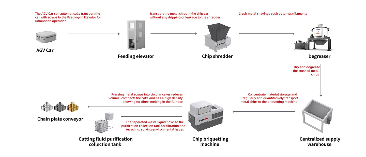 Em resposta às necessidades específicas do Grupo Ansteel, ENERPAT projetou meticulosamente uma solução abrangente que inclui um carrinho AGV, uma talha de alimentação, uma máquina de briquetagem de pó de ferro BM-1090, um recipiente de alimentação centralizado, um transportador de descarga e um tanque de coleta e purificação de fluido de corte. Através de medidas como testes de amostras, projeto de processo de automação e tratamento de vedação, foi alcançado um processo de produção totalmente automatizado e livre de vazamentos, desde a coleta de aparas de ferro até a formação de briquetes.