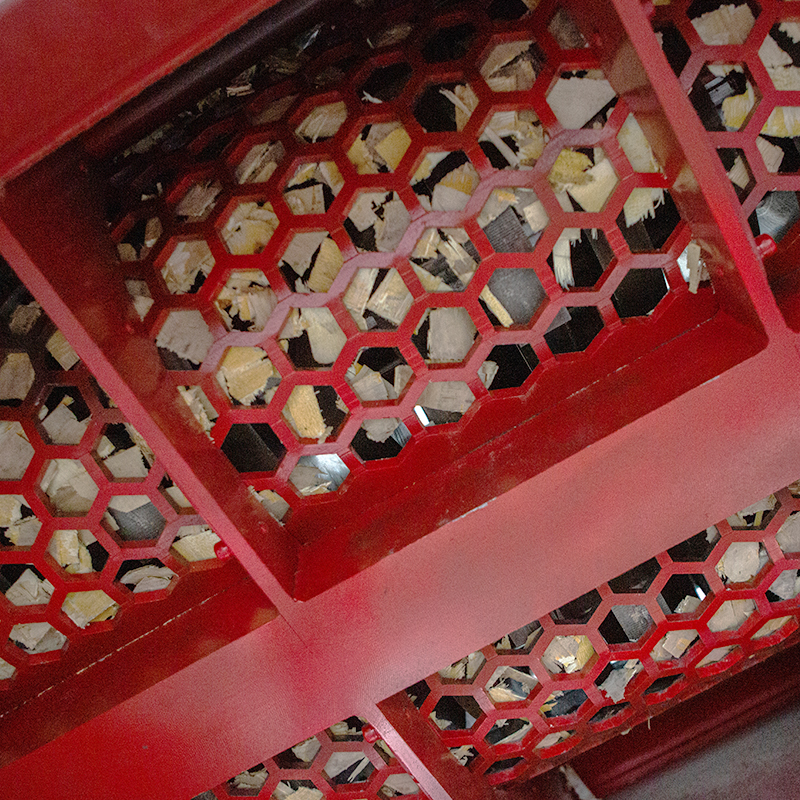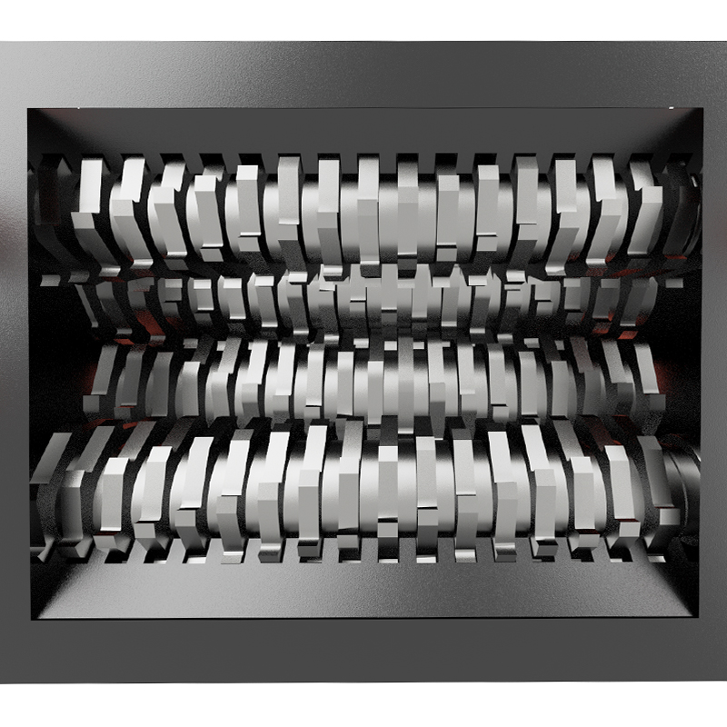 Os materiais são triturados utilizando o princípio de cisalhamento e rasgo entre os quatro conjuntos de rolos de facas.
